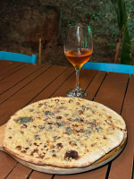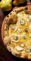 Massa de fermentação lenta, queijo mussarela, molho de tomate feito com tomate pelado, pedaços de gorgonzola e peras marinadas em molho agridoce.