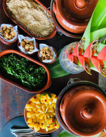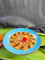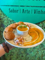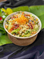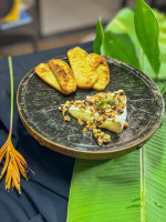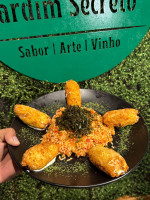 Mix de folhas, camarão ao molho pesto, banana da terra, azeitonas e crocantes de castanhas.