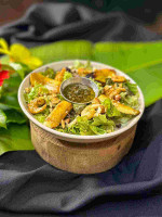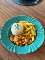 Mix de folhas, molho caesar, parmesão ralado, frango desfiado e macaxeira palha.