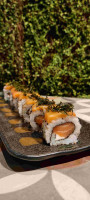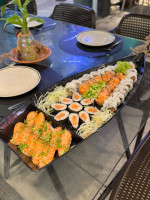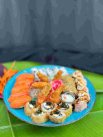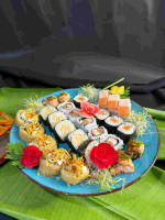 5 hossomaki de salmão fresco, 5 uramaki de salmão fresco e kani, 5 futomaki de salmão grelhado, 5 hot rolls de salmão grelhado e skin, 4 dragon, 3 batera ( salmão fresco e patê de kani) .