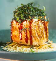 Lâmina de salmão maçaricado, cream cheese, couve frita, arroz japonês e farofa especial.