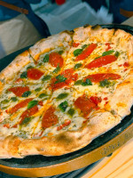 Massa de fermentação lenta, queijo mussarela, molho de tomate feito com tomate pelado, queijo brie em fatiase geleia de pimenta .