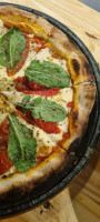 Massa de fermentação lenta, queijo mussarela, molho de tomate feito com tomate pelado e tomate confit e pesto de manjerição.