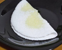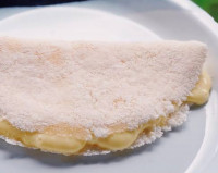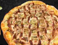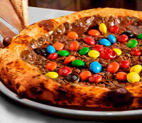 Massa de fermentação lenta tamanho pequeno, banana, chocolate branco, açúcar, canela e queijo mussarela.