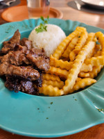 Filé em cubinho flambados no conhaque, petalas de cebola roxa, molho especial e batata frisadas