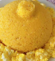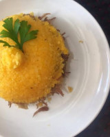 Filé ao molho roti,farrofa de bacon e pimenta do reino,servido com arroz cremoso de queijo do reino.