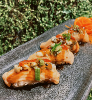 Saboroso niguiri de salmão maçaricado com um toque especial de queijo gorgonzola e um leve toque adocicado e refrescante da geleia de pimenta biquinho. (4 UND)