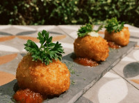 Bolinho de risoto com parmesão, geleia de tomate e maionese de limão, 6 unidades.
