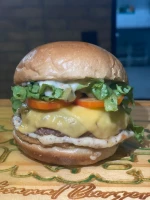 Pão brioche, hambúrguer de 150g, um delicioso creme de gorgonzola, queijo prato, Alface e tomate.