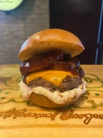 Hambúrguer de costela 150g, maionese defumada, queijo cheddar 2 fatias, 2 onion rings e molho barbecue