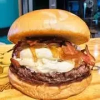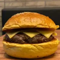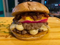Hambúrguer de 150g, queijo cheddar cremoso, cebola caramelizada, bacon crocante no pão australiano