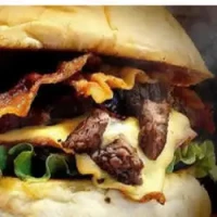 2 smash Hambúrguer 100g (total 200g), molho especial, tomate, alface picado, picles, american cheese, bacon no pão brioche
