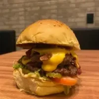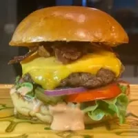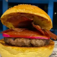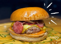 Hambúrguer de costela 150g, molho da casa levemente apimentado, queijo cheddar fatiado, bacon, alface, tomate, picles e cebola roxa no pão brioche