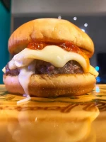 Hambúrguer de 150g, queijo brie, geléia de frutas vermelhas ou pimenta no pão brioche