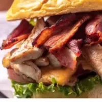 Frango em tiras, bacon crocante, queijo prato, presunto, ovo, alface e tomate no pão brioche