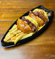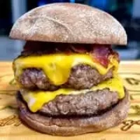Pão brioche, 2 smash hambúrguer 100g cada, queijo do reino, queijo gouda e bacon crocante