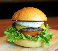 hambúrguer de 150g, molho tasty, queijo prato, tomate, alface picado no pão brioche