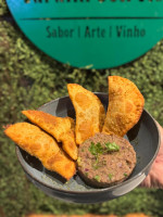 Carpaccio bovino, molho de alcaparras, pesto, mostarda, parmesão e pão caseiro.
