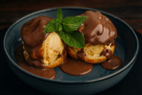 Massas de Carolina frescas, recheadas com sorvete de creme e cobertas com ganache quente de chocolate.