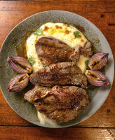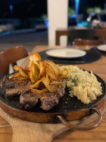 CARNE DE SOL, PURE CREMOSO, REDUÇÃO DE CALDO DE CARNE E ARROZ DE ALHO (SERVE 2 PESSOAS)